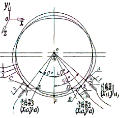 對于回轉(zhuǎn)窯的中心線測量問題來說,我們從擬合圓圓心坐標(biāo)可以了解到,與輪帶理想圓心相對比,擬合圓圓心在y方向上的運動偏移較大,這也就像我們說明了為什么許多測量筒體中心線的方法(特別是將傳感器布置在筒體正下方測量的檢測方法)存在著豎直方向比水平方向測試結(jié)果誤差大的原因。在測量回轉(zhuǎn)窯中心線的位置選擇時,一般會要求測點盡可能布置在筒體下方以便安裝傳感器。我們在對于變形后輪帶外徑及擬合圓的對比之后了解到,在回轉(zhuǎn)窯的筒體正下方區(qū)域,變形后的筒體截面和擬合圓存在著很大的誤差。而與垂直方向大約呈46渡的方向,變形后的筒體截面和擬合圓出現(xiàn)相交現(xiàn)象。同時,紅星機械 又通過分析輪帶外徑上節(jié)點位移得知:在40°-50°區(qū)域內(nèi),輪帶節(jié)點位移幅度比較小,所以和擬合圓的誤差也小。因此,在筒體理論垂直軸線一側(cè)安裝傳感器1和2,使傳感器探頭所對應(yīng)的測點a、b的位置在40°-50°區(qū)域內(nèi)且與筒體表面保持垂直,在of的另一側(cè)安裝傳感器3,使其和傳感器1或2關(guān)于of對稱。