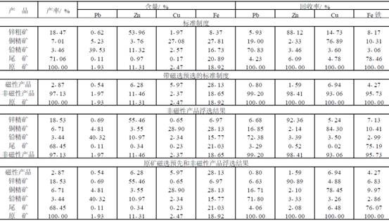 在具有高磁化系數的變質礦石閉路試驗時,將浮選作業(yè)的原礦進行磁選,可分出產率為2.825%的磁性產品。在按照標準流程和工藝制度浮選非磁性產品時,可以提高浮選工藝指標,同名產品的鋅、鉛和銅回收率分別提高了2.77%、0.97%和1.56%。精礦的質量也相應提高:鋅品位提高1.50%,鉛提高0.79%和銅提高1.82%。特別是鋅精礦中的銅含量從1.97%降到了0.65%。因此可以直接發(fā)送給消費者。閉路浮選試驗金屬平衡表如表2所示。