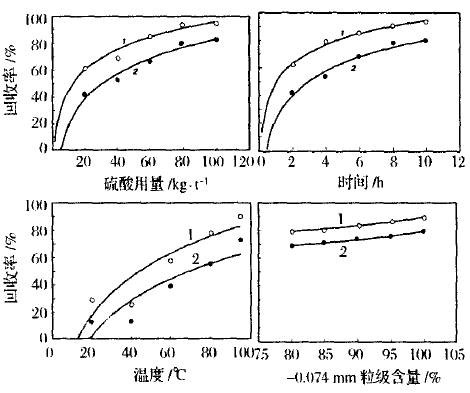 圖2磁性產品中的鋅(1)和銅(2)回收率與浸出條件之間關系曲線