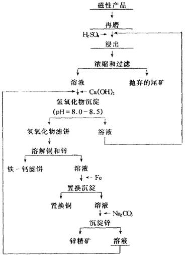 在使用此工藝時,磁性產品的處理成為一個懸而未決的問題。將磁選產品混到鋅精礦中可得到以下成份的鋅精礦(%):48.87zn、0.67pb、1.36cu和9.81fe。消費者對這種鋅精礦的鋅品位和鐵含量都接受。處理這種磁性產品的另一種方法就是用充酸浸出。用100g樣品進行試驗。在一定條件下浸出,然過濾礦漿,對浸出渣和溶液進行化學分析(圖2)。