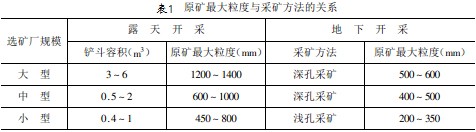 原礦 粒度d的確定:所謂 粒度,是指95%的礦量通過(guò)某一篩孔尺寸的粒度。原礦 粒度與采礦有關(guān),即與礦床賦存條件、礦山規(guī)模、采礦方法、裝運(yùn)設(shè)備等有關(guān)。它們之間的關(guān)系如下表1。由此可知原礦 粒度范圍是200-1400mm。