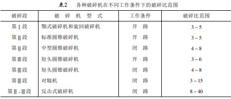 總破碎比等于各段破碎比的乘積,即s=s1×s2×s3。各段破碎比與各段破碎機(jī)的型式、流程類型和礦石性質(zhì)有關(guān)。各種破碎機(jī)在不同條件下,其破碎比范圍,如表2所示(難碎性礦石取小值、易碎性礦石取大值)。