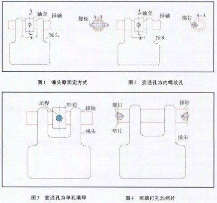 1)如圖2所示,將錘軸上打通孔改為錘軸上打內(nèi)螺紋孔,用螺栓固定。螺栓緊固后應(yīng)將螺桿與軸套電焊。